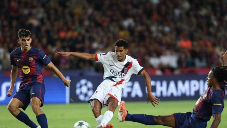 可巴黎到底是卫冕冠军,人家根本没慌。第38分钟,门德斯左路带球狂奔,过掉两个人之后斜传给马尤卢,这19岁的小将一脚爆射就把比分扳平了。巴萨后防线问题这下藏不住了——库巴西和埃里克-加西亚上半场就被冲得够呛,孔德那次铲空直接让马尤卢单刀面对门将。