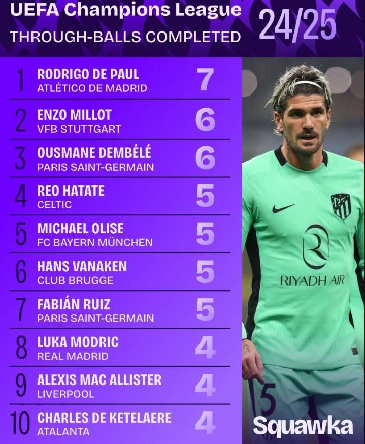 2024-25赛季欧冠直塞榜:德保罗7次居首,登贝莱6次